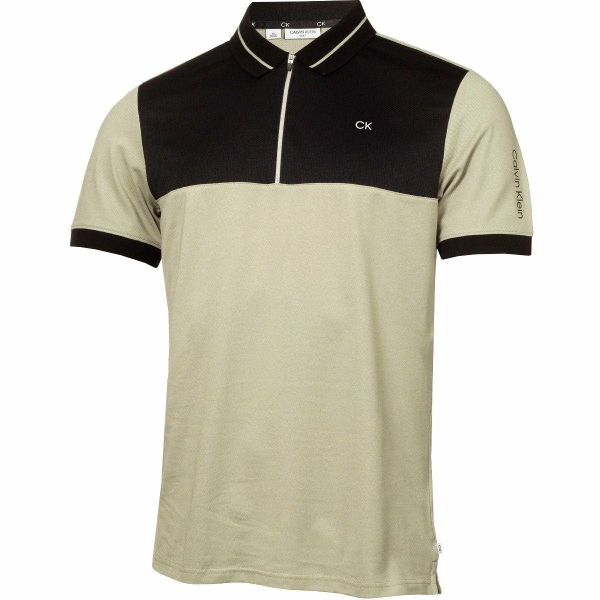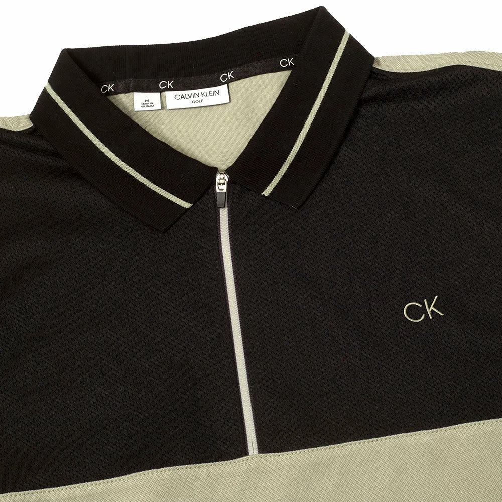 A slimline modern look with zip closure, mesh overlay panel on the upper chest and Calvin Klein branding on both the left chest and the left sleeve results in a stylish garment that will have you looking good from tee off to the 19th hole.