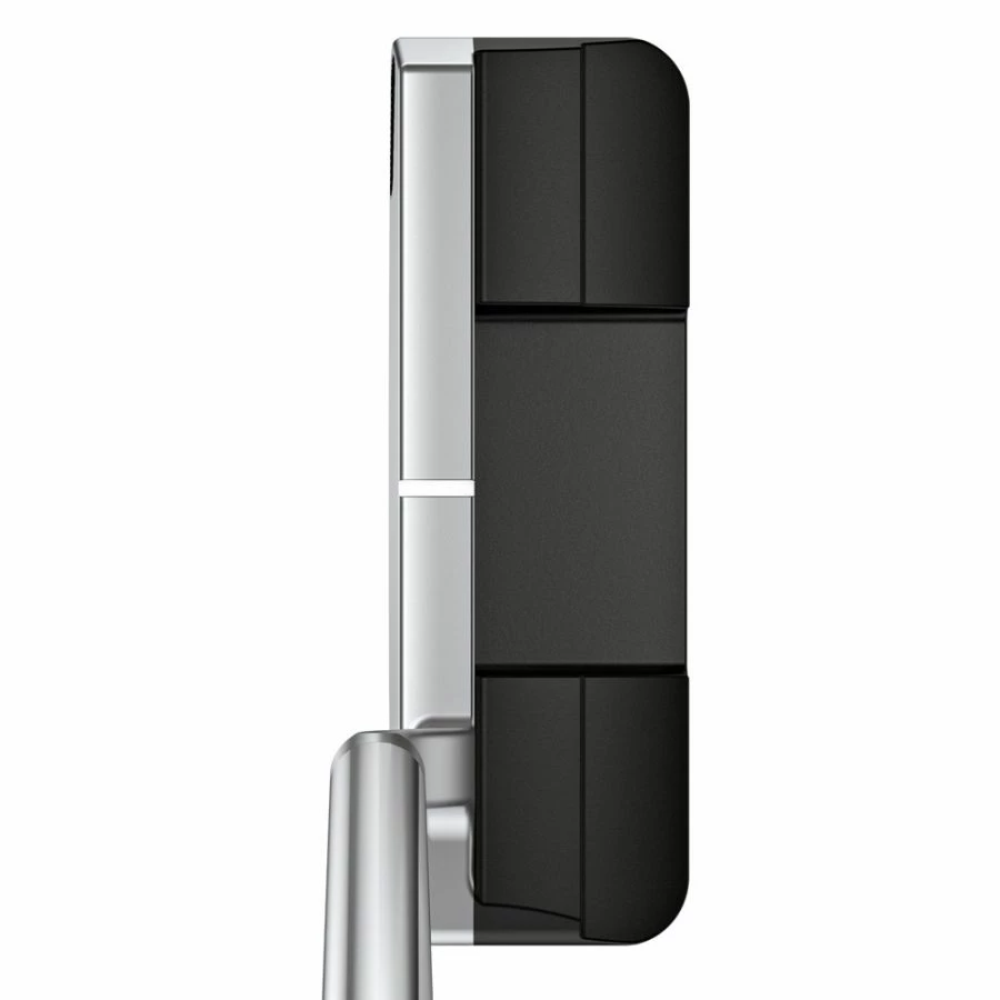 Tungsten toe and heel weights provide stability and forgiveness for improved accuracy, and the shallow milled face ensures a firmer feel and consistent ball speed with pleasing acoustics. A platinum topline contrasts against a black cavity to draw the focus forward, where a short alignment line and ball-width cavity floor frame the ball. Fits a strong-arc stroke type.