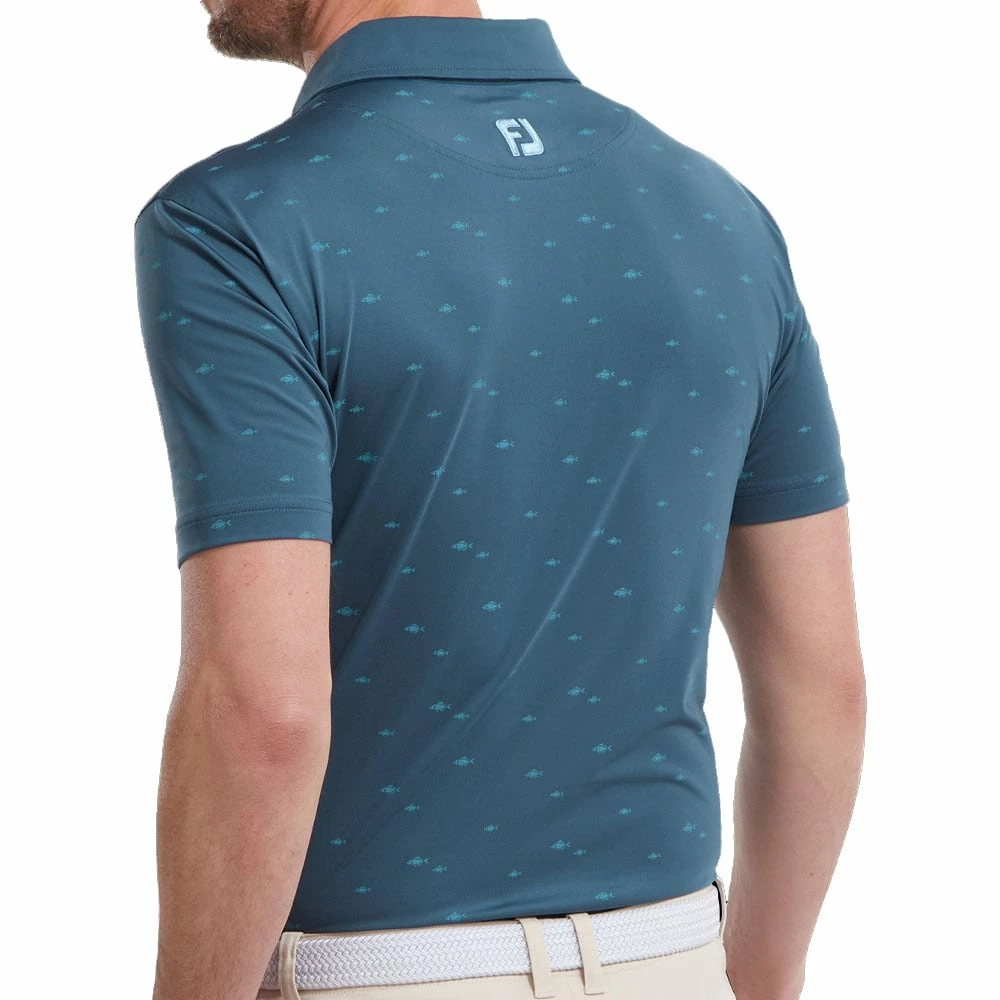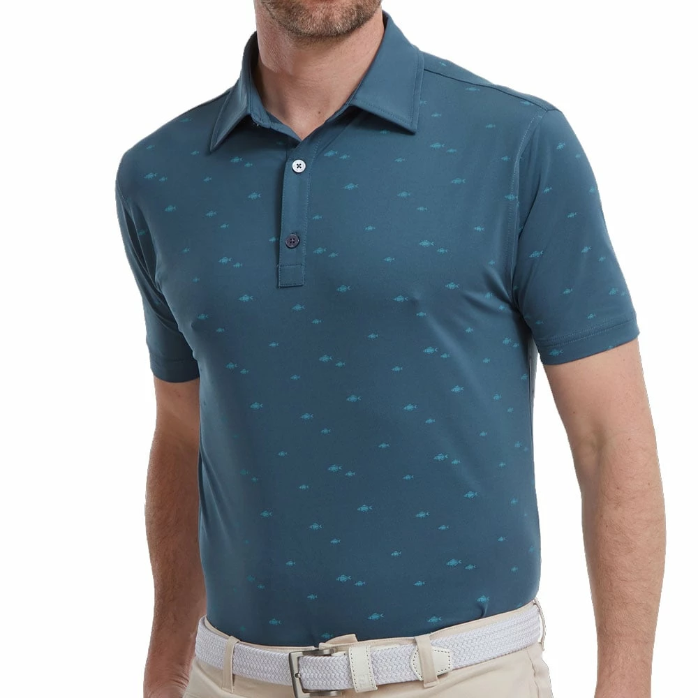 The FootJoy School Fish Print Lisle Polo Shirt is made from a soft fabric which is soft against the skin, with moisture-wicking technology to move moisture away from the garment, keeping you fresh in warm conditions or after the unexpected spells.