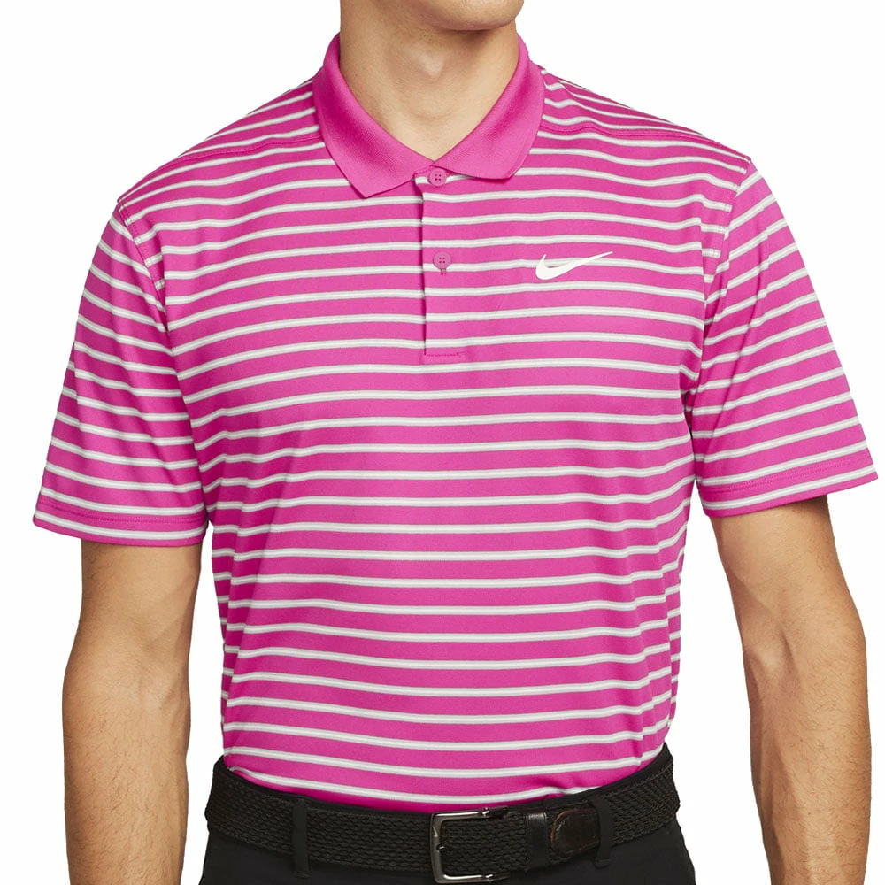 The Nike Dri-FIT Victory Striped Polo shirt features a 2-button placket, classic fold-over collar, and an all-over stripe design for added style.